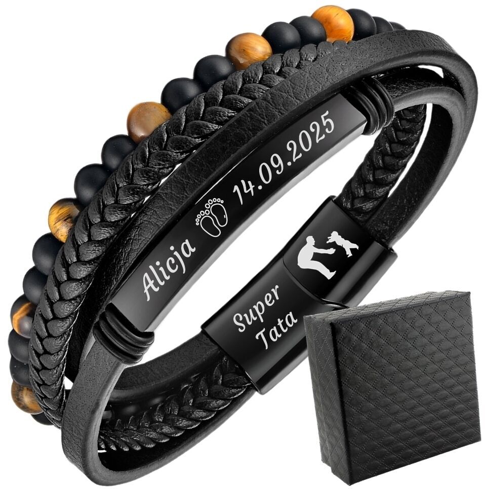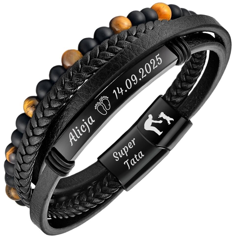 Szukasz nieszablonowego personalizowanego prezentu dla niego, który połączy surowy męski styl z naturalną energią? Ta bransoletka męska z minerałów to fuzja dwóch niezwykłych kamieni, które od pokoleń fascynują swoją strukturą. Matowy onyks, będący symbolem niezłomności, spotyka się tu z tygrysim okiem – kamieniem, który pod wpływem światła ożywa, ukazując głębokie, brązowe pasma przypominające spojrzenie drapieżnika. To biżuteria stworzona dla liderów i mężczyzn pewnie kroczących przez życie. Wybierając tę bransoletkę z grawerem, zyskujesz możliwość utrwalenia na niej osobistej historii. Twoją unikalną dedykację naniesiemy nowoczesną metodą laserową, całkowicie za darmo!