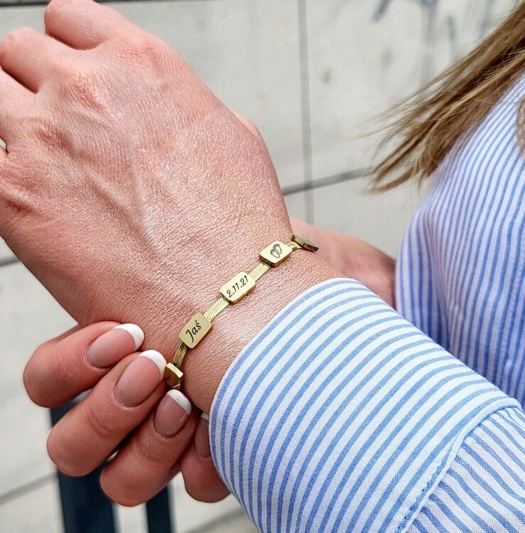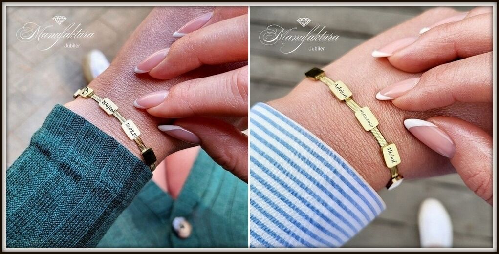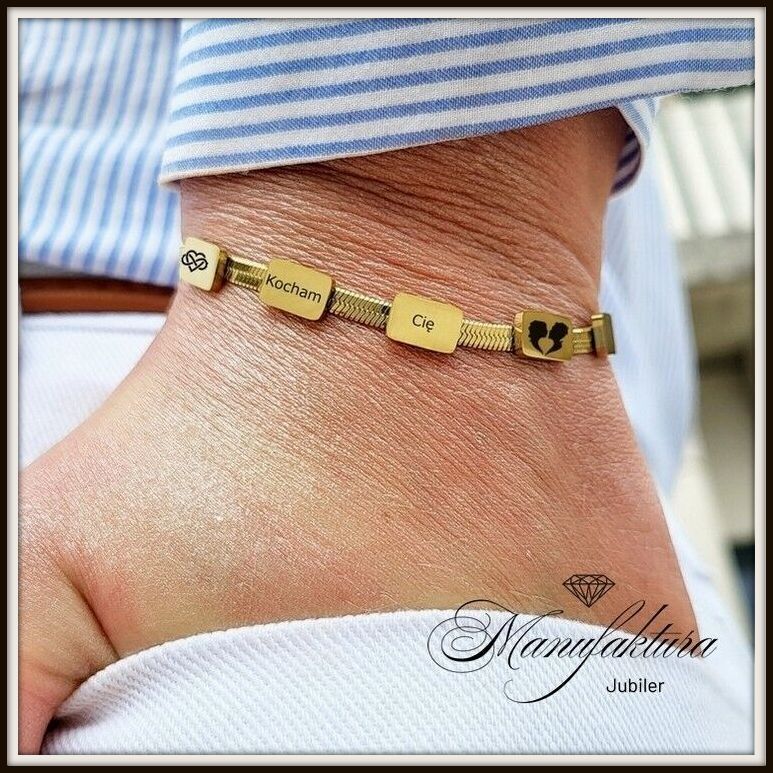 Dlaczego zakochasz się w tej bransoletce? Ten model to prawdziwy must have biżuteryjnych upominków, który podbija serca naszych Klientek. Możesz kreować jej wygląd dodając swoje napisy, które zawsze wykonujemy gratis! Więcej o grawerunkach w zakładce obok ''GRAWER''. Bransoletka idealnie nadaje się na wyznanie miłości, poprzez grawer np. ważne daty, imiona ukochanych osób czy po prostu, tajemnice zapisaną ''szyfrem'', znaną tylko ich właścicielkom. Oryginalnie ozdobi nadgarstek każdej Pani.