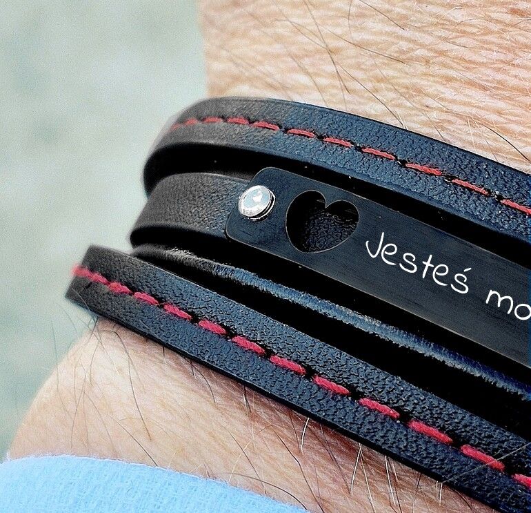 ELEGANCKA bransoletka skórzana CZERWONE PRZESZYCIA z grawerem