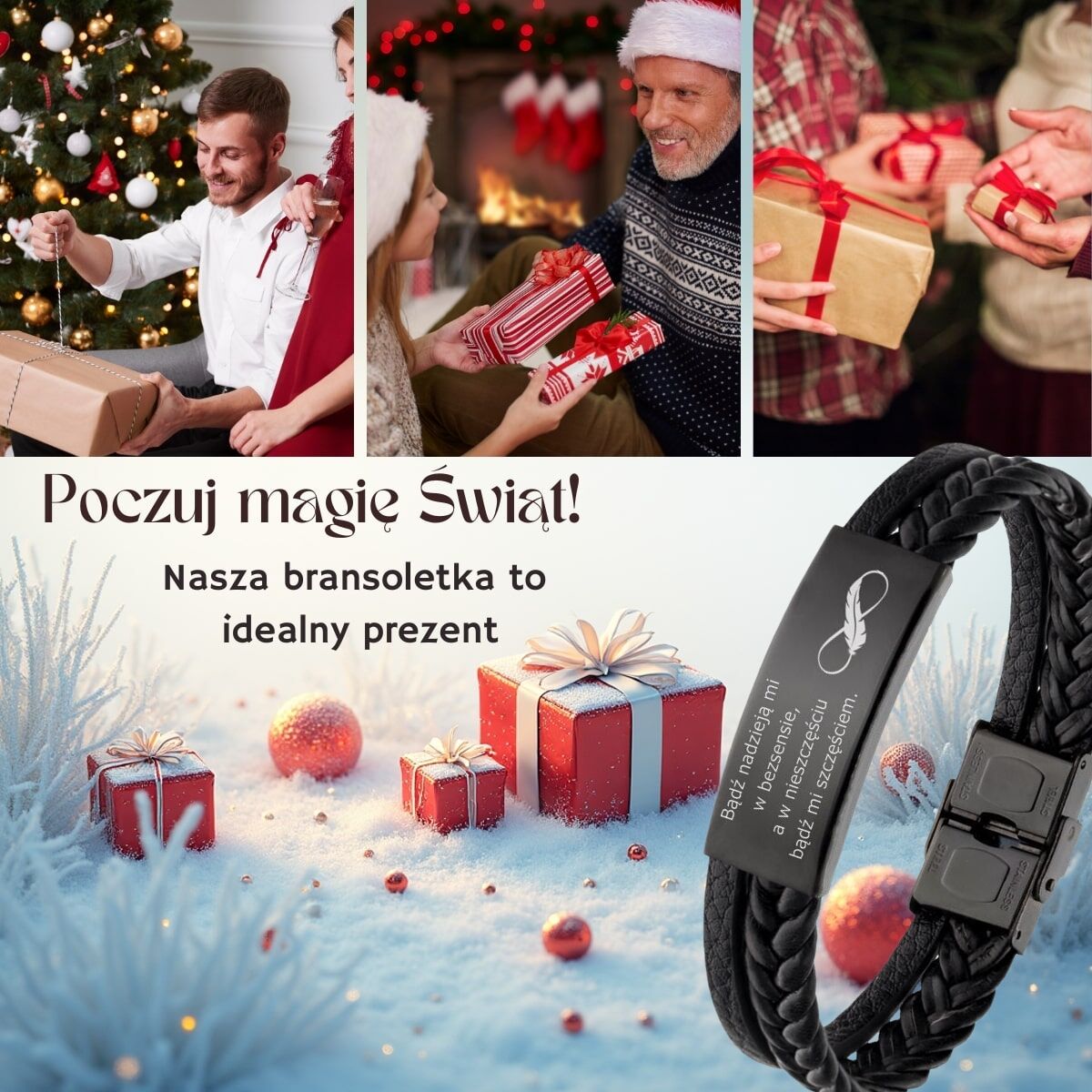Elegancka CZARNA Męska bransoletka skórzana z grawerem