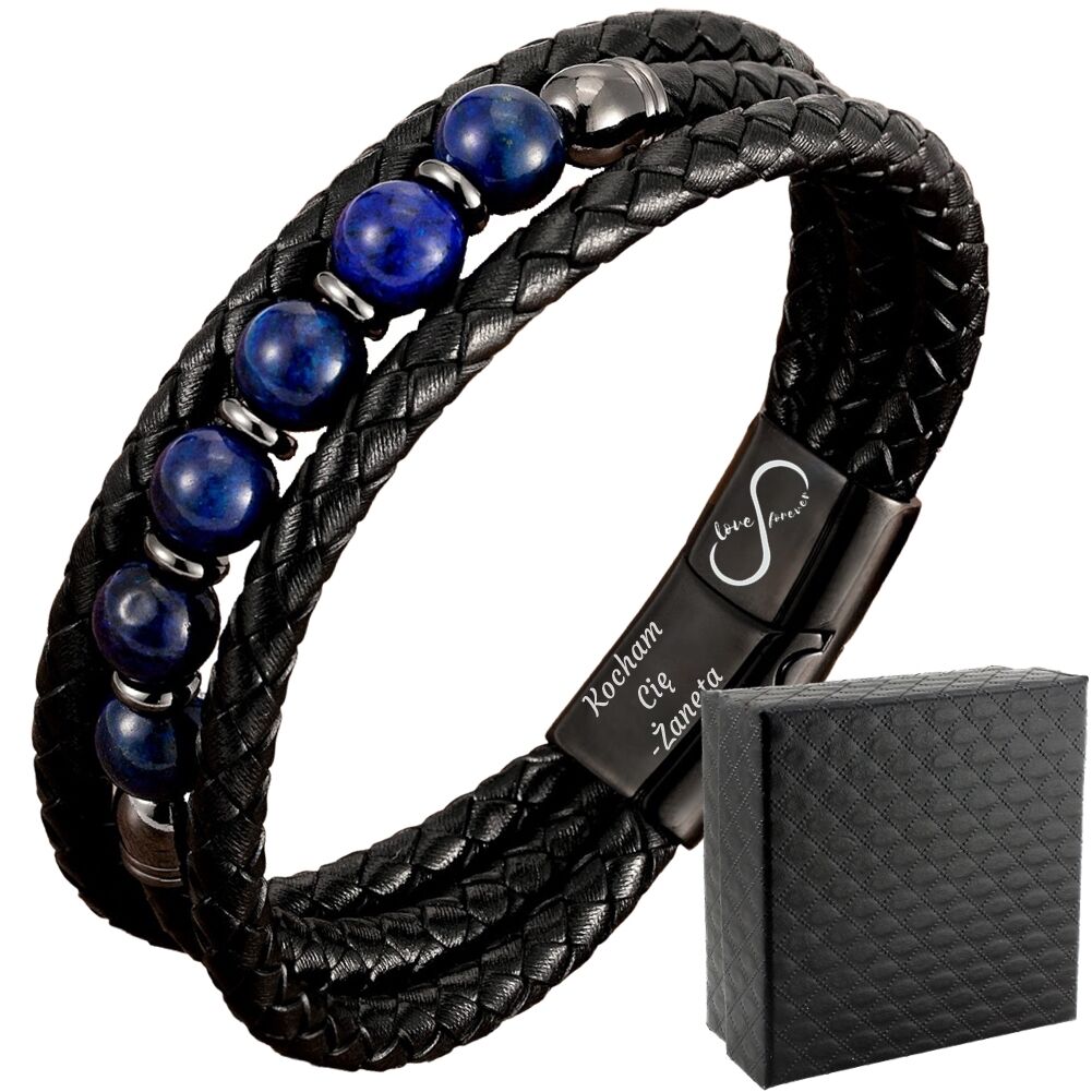 Szukasz nieszablonowego personalizowanego prezentu dla niego, który wyróżnia się szlachetnym kolorem i prestiżowym wyglądem? Ta bransoletka męska z kamieni naturalnych to propozycja dla mężczyzn, którzy nie boją się wyraźnych akcentów. Lapis Lazuli to kamień bogów i królów o intensywnej, nocnej barwie błękitu, który od wieków zdobił insygnia władców i był ceniony za wspieranie jasności umysłu oraz pewności siebie. W jego strukturze zatopione są złociste drobinki pirytu, które przypominają rozgwieżdżone niebo, nadając każdemu egzemplarzowi unikatowy, kosmiczny charakter. Minerał ten jest symbolem mądrości i szczerości, pomagając właścicielowi w wyrażaniu własnej prawdy. W połączeniu z bransoletką z grawerem zyskujesz biżuterię o potężnym ładunku emocjonalnym. Twoje osobiste przesłanie uwiecznimy na zapięciu całkowicie za darmo!