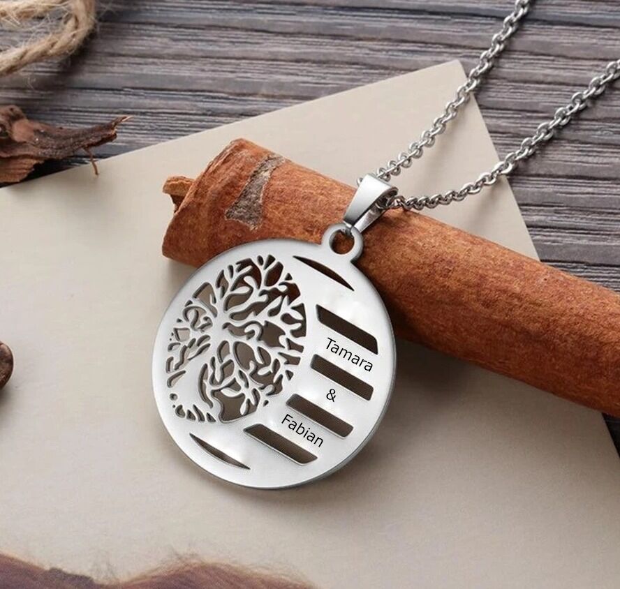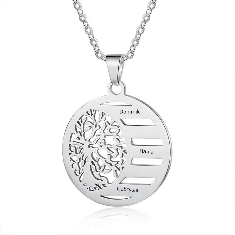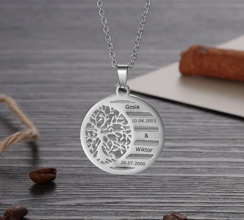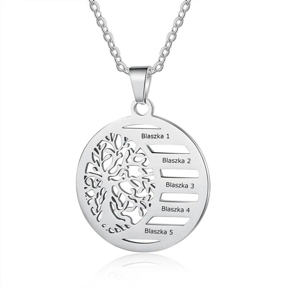 Efektowny naszyjnik z zawieszką z drzewem, gdzie znajduje się pięć miejsc na Twój grawerunek. Produkt wykonany z najwyższej jakościowo stali chirurgicznej 316L. W swoim asortymencie posiadamy taki sam naszyjnik w kolorze złotym.