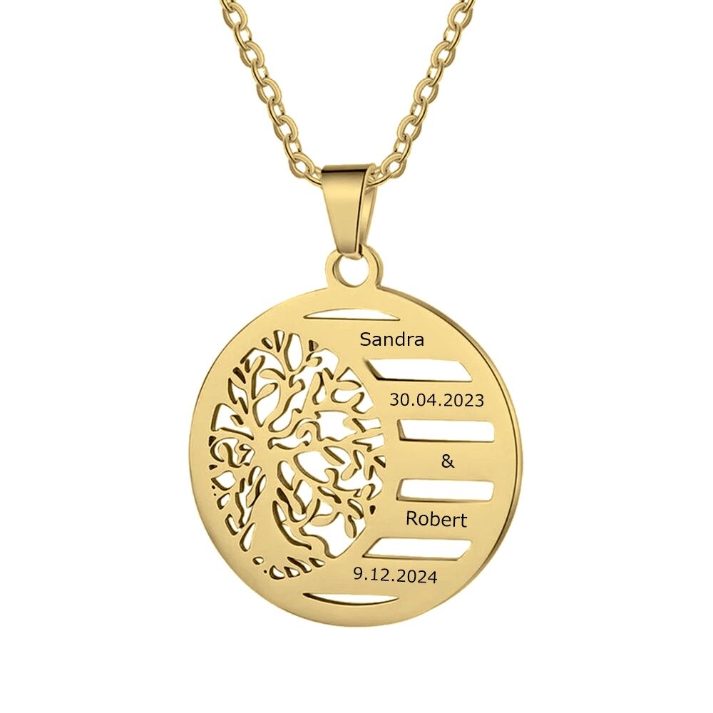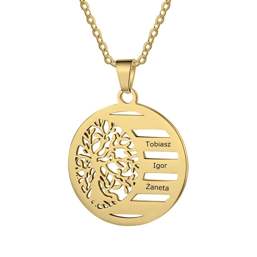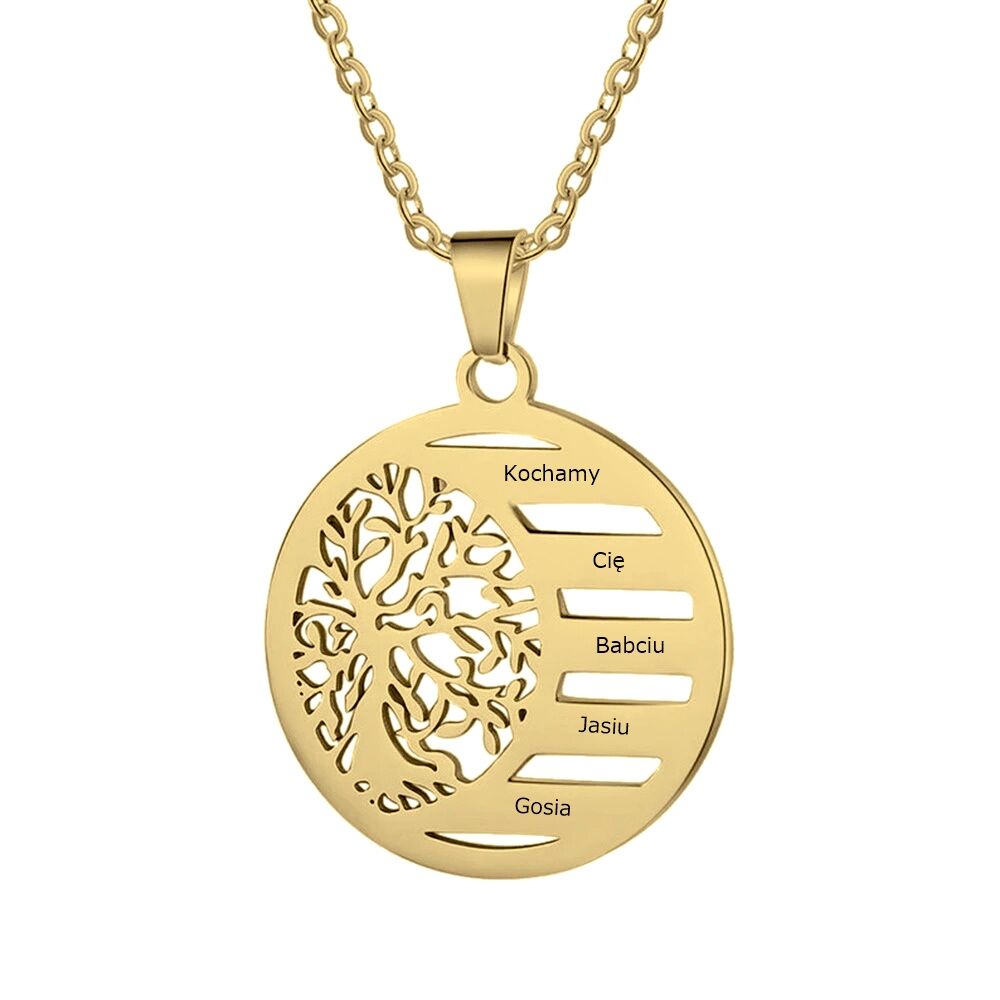 Efektowny naszyjnik z zawieszką z drzewem, gdzie znajduje się pięć miejsc na Twój grawerunek. Produkt wykonany z najwyższej jakościowo stali chirurgicznej 316L. W swoim asortymencie posiadamy taki sam naszyjnik w kolorze srebrnym.