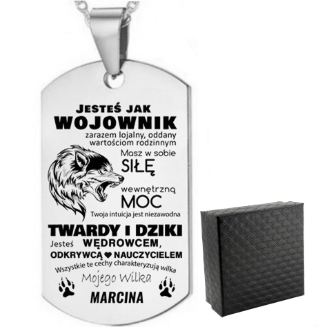 Oryginalny naszyjnik z gotowym grawerunkiem Wilka. Prosimy o wpisanie w polu "Tekst do graweru" Imię jakie ma zostać wygrawerowane. Naszyjnik wykonany z najwyższej jakościowo stali chirurgicznej 316L. W naszym asortymencie posiadamy różne wzory i kolory tych nieśmiertelników.
